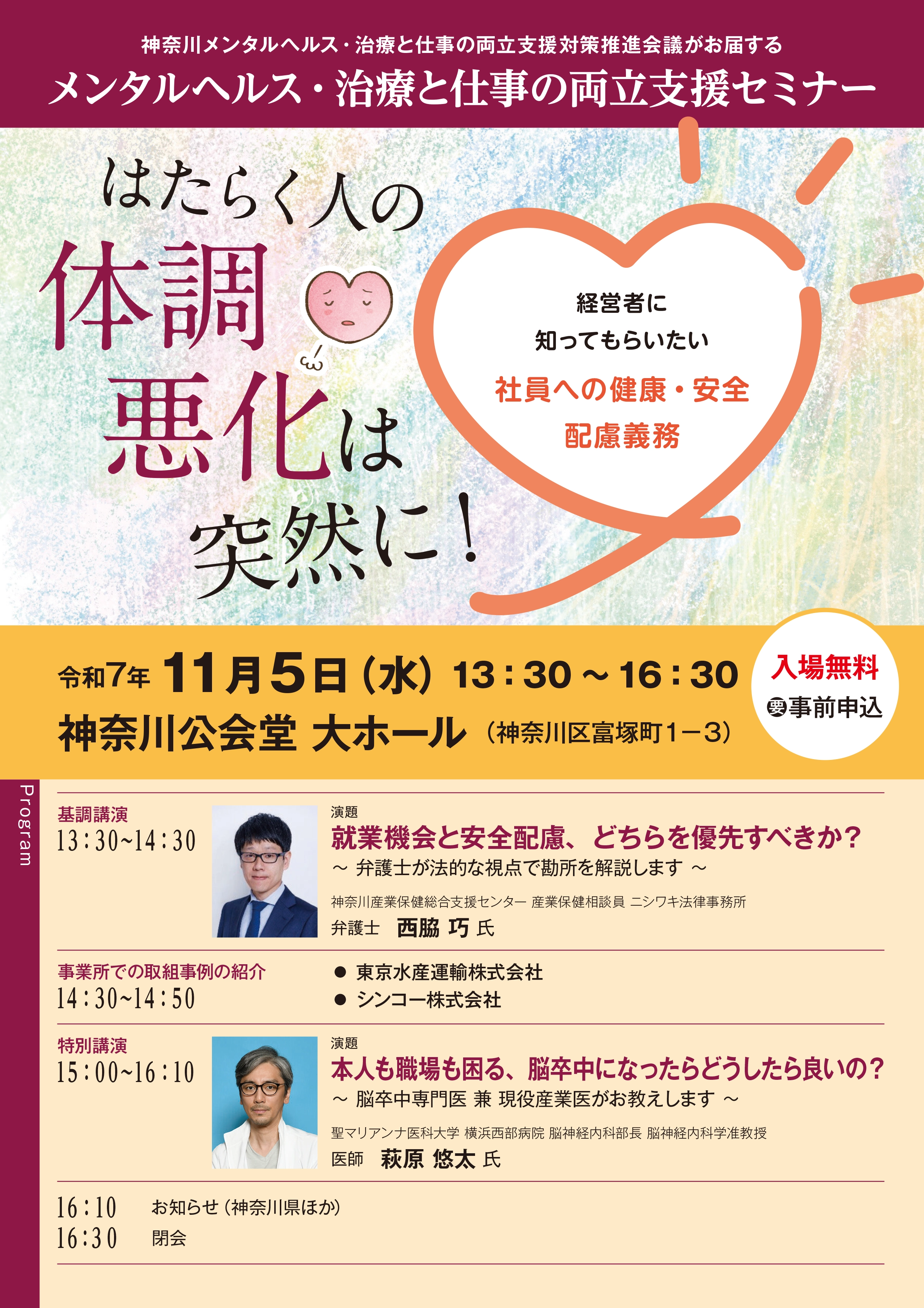 11月5日、神奈川メンタルヘルス・治療と仕事の両立支援対策推進会主催でのセミナーにて、萩原悠太准教授が「本人も職場も困る、脳卒中になったらどうしたら良いの? ~脳卒中専門医 兼 現役産業医がお教えします~」と題しての講演を行いました。